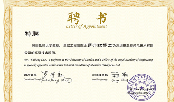 風(fēng)勁帆滿海天闊,牽手闊步新征程!2021年9月1日,深圳市亞泰光電技術(shù)有限公司特聘英國倫敦大學(xué)教授、皇家工程院院士羅開紅博士為高級技術(shù)顧問。亞泰光電總經(jīng)理鄭翔為羅開紅博士頒發(fā)了聘書。