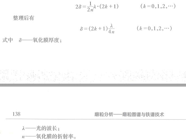 該式表明,當磨粒表面氧化膜的厚度恰恰等于某一單色光1/4波長的奇數倍時,其表面就呈現(xiàn)出該單色光的互補色,例如,當氧化膜的厚度是藍/紫色1/4波長即約0.038um時,磨粒表面呈草黃色,當氧化膜增厚是波長較長的紅/橙色光1/4波長即約0.055um時,磨粒表面呈黃色,不同材質金屬表面氧化膜生長速度是不一樣的,因此可以根據加熱后同一溫度下金屬材料的顏色(回火色)來判斷材料的合金屬類,這就是鐵譜片加熱分析法的原理。