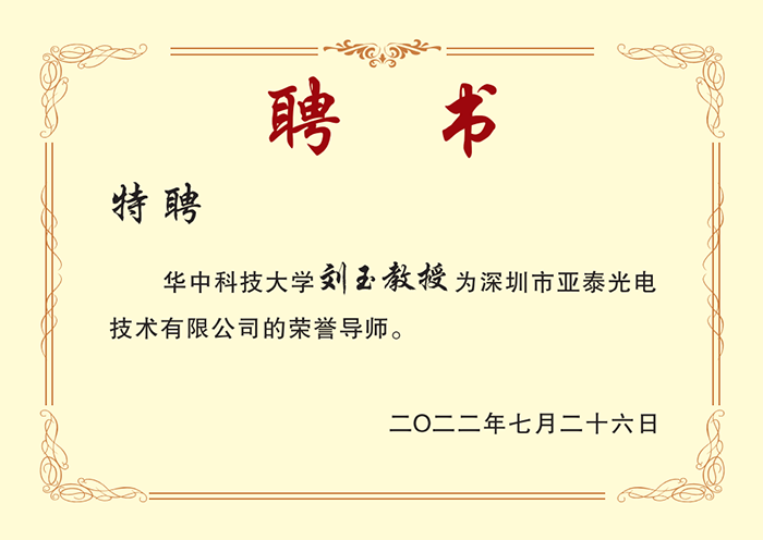 鄭總表示:國將興,必貴師而重傅。師者,傳道授業(yè)解惑。今天,非常榮幸的邀請到華中科技大學(xué)劉玉教授擔(dān)任亞泰光電榮譽(yù)導(dǎo)師,期望亞泰光電在劉玉導(dǎo)師的指導(dǎo)下能更上一個新臺階。劉教授帶領(lǐng)的Dian團(tuán)隊(duì)孵化出了60多家公司,誕生了2家獨(dú)角獸,其中,有25家企業(yè)估值過億,兩名弟子榮登福布斯“中國30位30歲以下創(chuàng)業(yè)者”榜單。劉教授用實(shí)際行動詮釋了敬業(yè)、無私的高尚精神,為莘莘學(xué)子們謀劃了未來,點(diǎn)亮了人生!